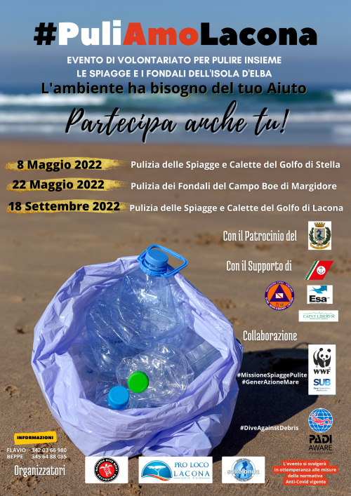L'iniziativa è resa possibile grazie al contributo di Capitaneria di Porto, Protezione Civile Mare e Monti Lacona, Esa spa, Caput Liberum srl, WWF sub, PADI.