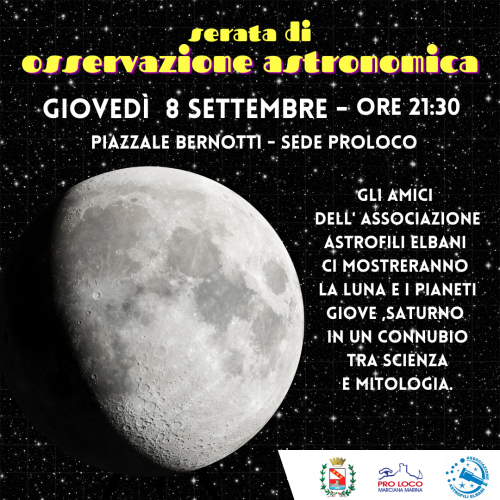 Una serata di osservazione astronomica grazie agli Amici dell'Associazione Astrofili Elbani che allestiranno una postazione con i loro telescopi professionali per dare la possibilità a grandi e piccoli di osservare le meraviglie del cielo estivo.