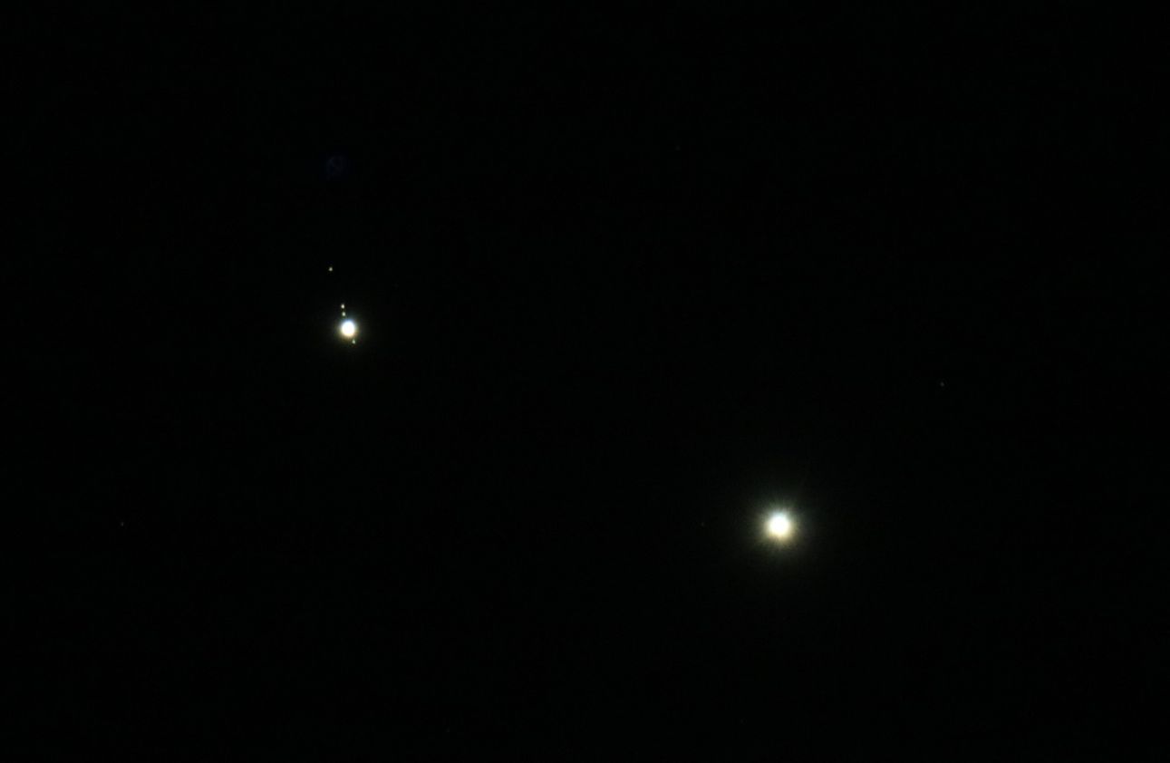 Nelle foto a maggiore ingrandimento, scattate il 1° marzo 2023, ore 19:30 circa, si vedono anche le 4 lune principali di Giove, 4 puntini vicino al pianeta a sinistra.