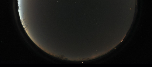 Nella foto la potete distinguere lungo il bordo inferiore dell'immagine, come un tenue bagliore rossastro tra i rami degli alberi.