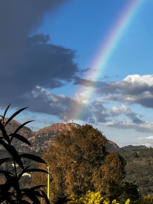 Un arcobaleno nettamente disegnato sembra "colpire", come una folgore, la crocetta che sovrasta Porto Azzurro, o forse, al contrario, scaturire proprio dal metallico oggetto della devozione longonese.