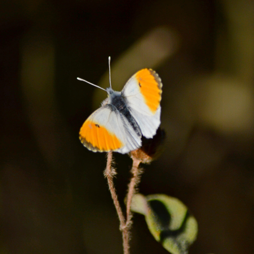 (Anthocharis cardamines, l'aurora è un lepidottero appartenente alla famiglia Pieridae. Lei di spalle che ferma osserva, Lui che di tanto in tanto le danza attorno)