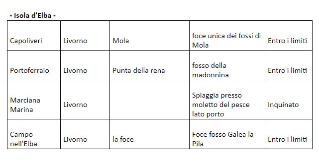 Sull’Isola d’Elba, è risultato inquinato il campione prelevato sulla spiaggia presso il moletto del pesce a Marciana Marina, risultano entro i limiti gli altri prelievi, effettuati alla foce unica dei fossi di Mola, a Capoliveri, al fosso della Madonnina, in località Punta della Rena a Portoferraio e alla foce del fosso Galea/La Pila, in località La Foce a Campo nell’Elba.