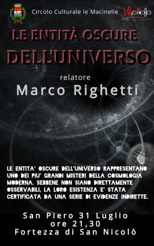 Mercoledì 31 luglio alle 21.30 nel chiostro di San Niccolò, il Circolo Culturale Le Macinelle ospiterà con piacere uno dei suoi più fedeli relatori, Marco Righetti, che tutte le estati ritorna all'Elba e ci viene a parlare della sua grande passione: le leggi e i misteri dell'Universo.