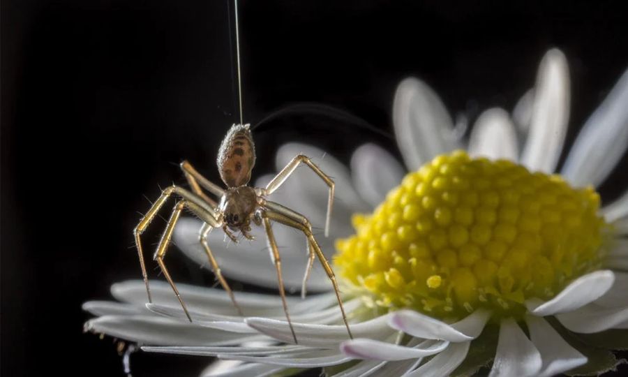 Figura 1. Questo ragno si è calato sui petali di un fiore grazie alla robusta dragline che è stata prodotta durante il moto di avvicinamento alla sua destinazione finale.