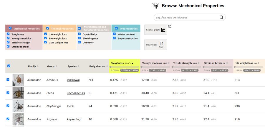 Il primo passo di questa joint-venture è stato lo studio della struttura e delle proprietà fisiche di oltre 1000 specie di ragni nel mondo. Attraverso un lavoro meticoloso, hanno estratto e analizzato lo RNA (2) per determinare le sequenze di amminoacidi che compongono le proteine delle dragline. Ne è nato un database formidabile reso disponibile alla comunità scientifica (3) che elenca in modo ordinato tutte le proprietà delle fibre, come visibile in figura 2.