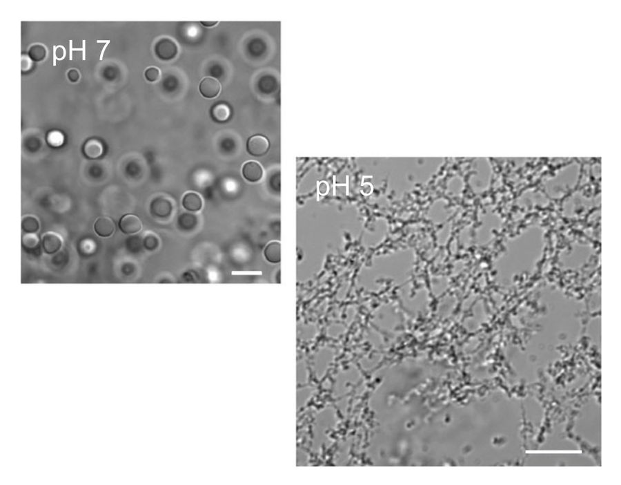 Figura 4. Immagini al microscopio elettronico della soluzione in due fasi sequenziali di processo. Il alto a sinistra le gocce di spidroine (droplets) ottenute nella primissima fase con pH neutro, in basso a destra la struttura dopo il gradiente di pH. In entrambe la barra di riferimento corrisponde a un segmento di 5 μm.