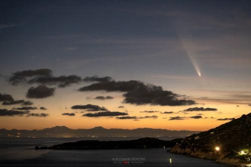 La cometa C/2023 A3 Tsuchinshan-Atlas fotografata dopo il tramonto da Capoliveri, sulla destra Capo Poro e il suo faro, sullo sfondo Bastia e la costa orientale della Corsica.