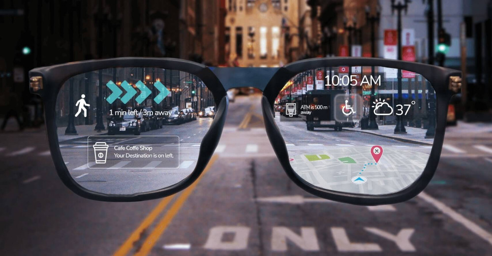 Figura 4. AR glasses utilizzati per la navigazione, in cui alla scena reale sono sovrapposte informazioni utili per spostarsi e per conoscere in dettaglio l’ambiente che si va ad incontrare.