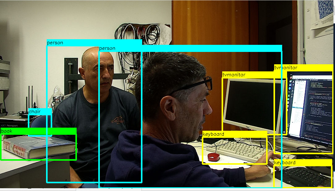 La parte più difficile, che ha a che fare con algoritmi di AI e Reti Neurali è l’ultima dell’elenco. La Figura 5 seguente mostra un frame catturato in laboratorio in cui il nostro software, opportunamente addestrato, riconosce persone e oggetti (in primo piano “alle tastiere”, come si usa dire nei concerti, il mio amico e socio Riccardo Galletti, sviluppatore software, e in secondo piano il sottoscritto):