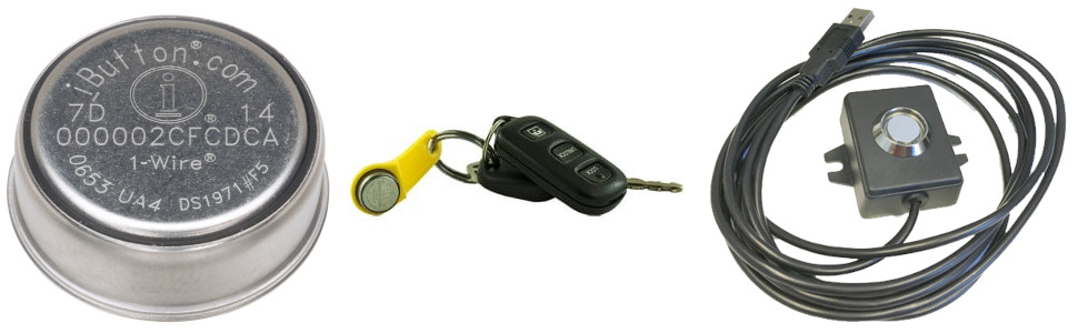 Figura 1. Da sinistra a destra: un dispositivo iButton, lo stesso inserito nel ‘fob’ da portachiavi (in questo caso giallo), un esempio di lettore/programmatore del dispositivo.