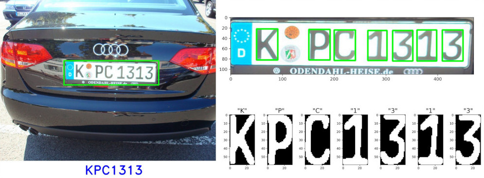 Figura 2. Sistema di AI per il riconoscimento targhe. Il riquadro della targa a sinistra viene ulteriormente segmentato per riconoscere i singoli caratteri che la compongono.