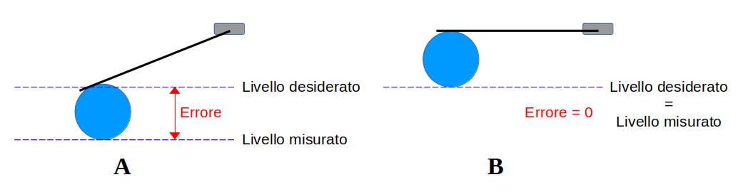 Nell’esempio del controllo di livello, l’errore è la distanza fra la quota desiderata e la posizione attuale del galleggiante. Quando il serbatoio è pieno, i due valori sono identici e di conseguenza l’errore è nullo. All’estremo opposto, quando il serbatoio è vuoto, i due valori sono molto diversi fra loro e l’errore è grande.