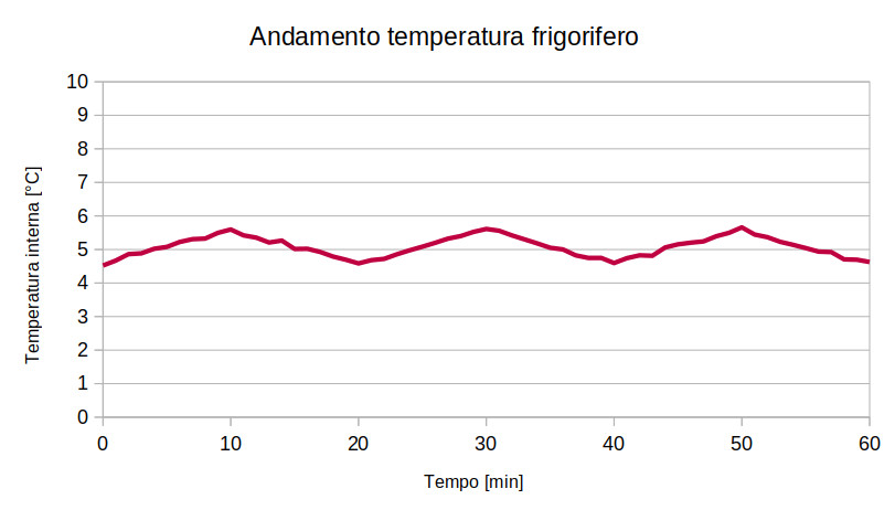 Figura 5. Grafico tipico della temperatura interna di un frigorifero di casa che mostra l’effetto di un controllo automatico del tipo “acceso o spento”.
