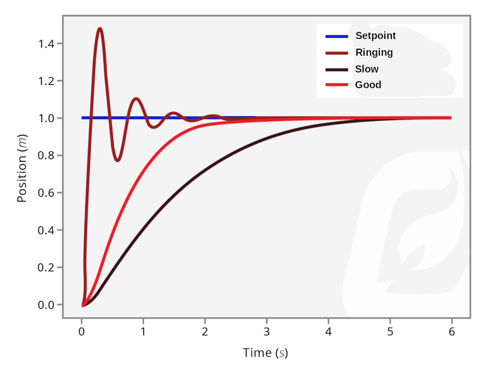 Se segue la curva marrone offre una risposta molto veloce ma al costo di veder superare sopra e sotto la posizione target alcune volte prima di stabilizzarsi effettivamente a quel valore (questo effetto si chiama “Ringing”).