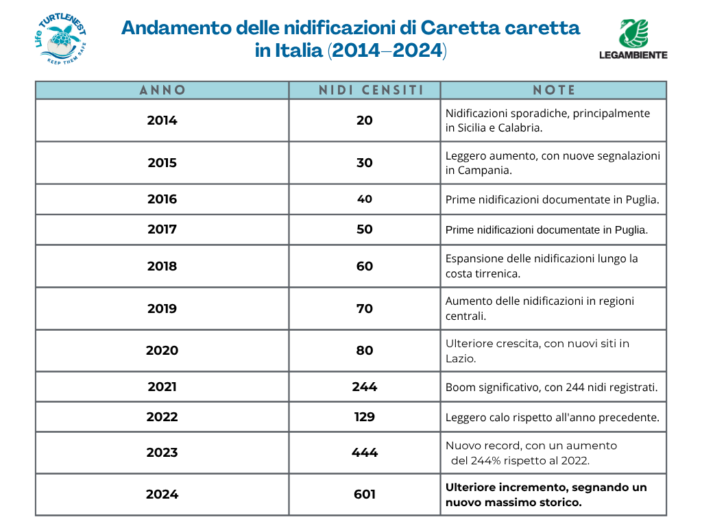 Se fino a qualche decennio fa le tartarughe nidificavano quasi esclusivamente sulle coste orientali del Mediterraneo (come Grecia, Turchia e Cipro), oggi le nuove generazioni scelgono sempre di più le coste occidentali: in particolare, in Italia nel solo 2024, sono stati segnalati ben 601 nidi, il numero più alto di sempre. Fino a pochi anni fa erano infatti solo poche decine: solo 20 nel 2014, 30 nel 2015, 40 nel 2016, 50 nidi nel 2017 e così via per poi gradualmente passare a un incremento più repentino tra il 2020 (80 nidi censiti) al 2021 (244 nidi).