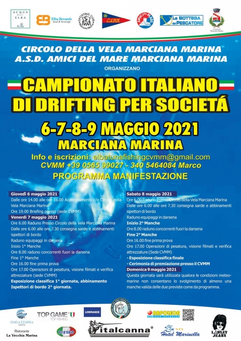 Il calendario agonistico 2021 del Circolo della Vela Marciana Marina si aprirà dal 6 al 9 maggio prossimi con un importante manifestazione di pesca, il Campionato italiano di Drifting per società 2021, organizzato in collaborazione con la Federazione Italiana Pesca Sportiva e Attività Subacquee e in particolare la Sezione FIPSAS Provinciale di Livorno.