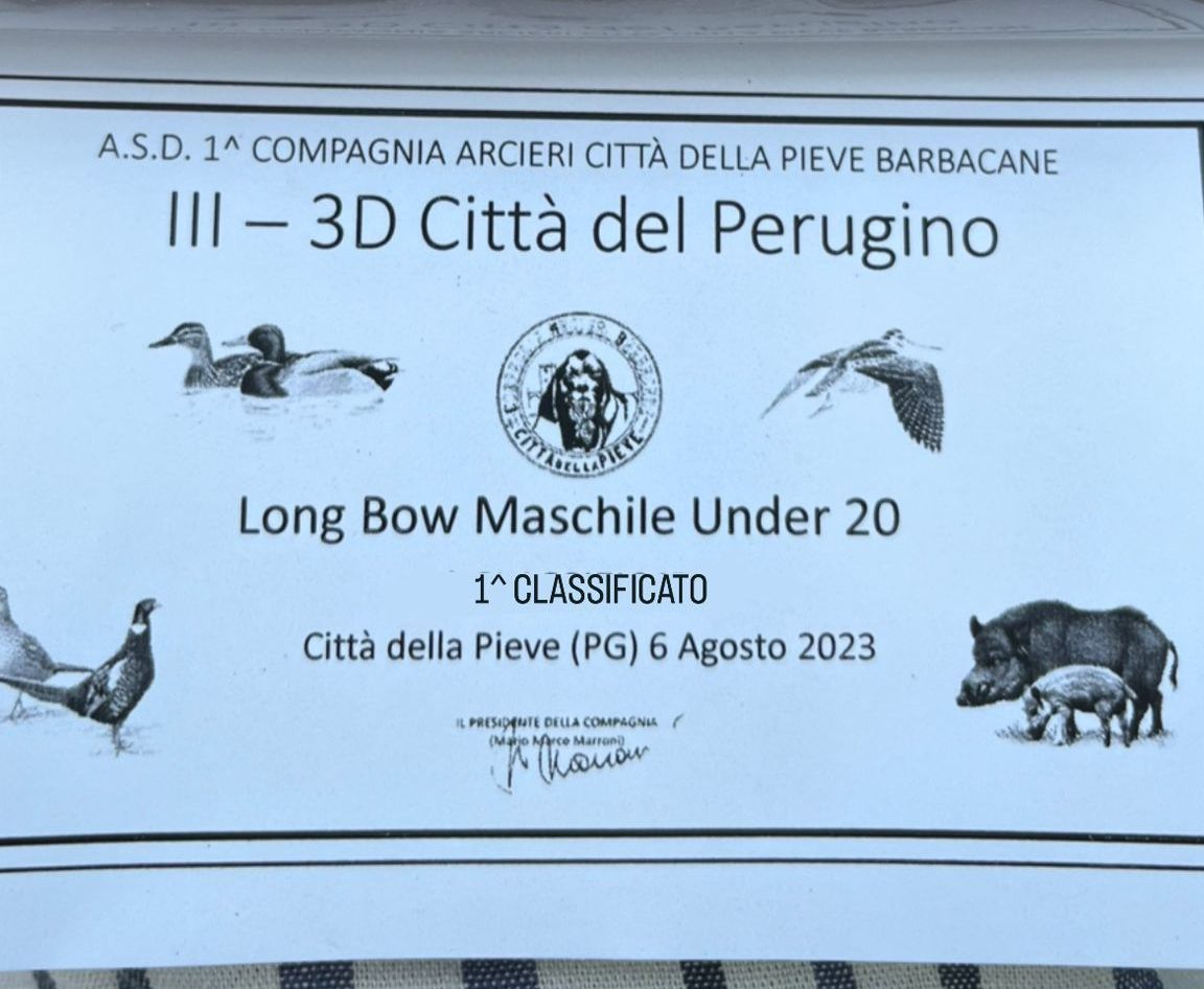 Il nostro atleta classe "under 20 divisione longbow" Matteo Cancro, si è impegnato nell'ultima gara di qualifica il 30 luglio a Città della Pieve (Pg), per il Campionato Italiano detto 3d (sagome tridimensionali di animali, finta caccia) arrivando primo.