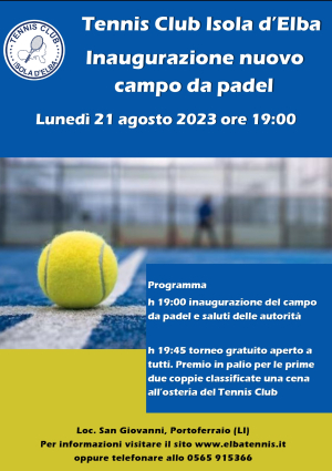 Il Tennis Club Isola d'Elba è lieto di comunicare che lunedì 21 agosto alle ore 19:00 si terrà l'inaugurazione del nuovo campo da padel, situato nei pressi dei campi da tennis all'aperto (lato campo da rugby).