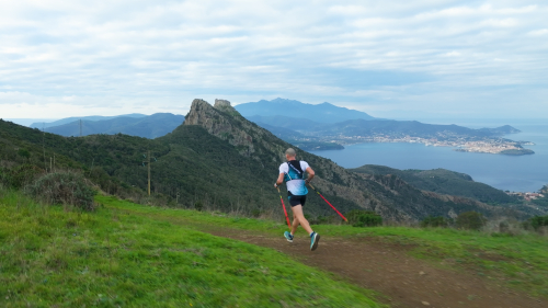 All’Elba, sua terra natia e percorso d’elezione per gare e allenamenti, ha affrontato la GTE lungo il tracciato originario, che si sviluppa da Cavo, sulla punta nord-orientale dell’isola, fino a Pomonte, sulla costa sud ovest, per un totale di 52km con 2700 metri di dislivello positivo: dalla Spiaggia di Frugoso a Cavo si sale seguendo il crinale verso ovest, a monte del paese di Porto Azzurro, proseguendo nell’entroterra fino al Monte Perone e poi al Monte Capanne, la vetta più alta dell’isola e tra i punti più sfidanti e panoramici del percorso, per scendere infine verso Pomonte. La GTE attraversa angoli particolarmente stimolanti dell’Elba per gli atleti e per gli escursionisti, collegando la maggior parte dei sentieri elbani e permettendo di osservare l’incredibile varietà geologica, morfologica e della vegetazione locale.