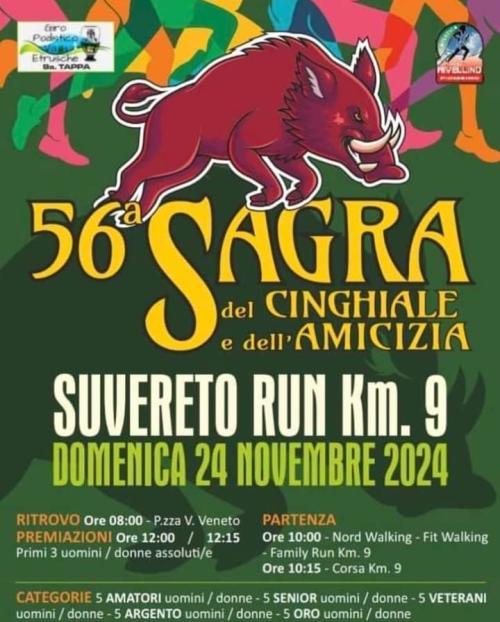 Domenica di festa alla Suvereto Run, gara podistica di 9 km inserita nel circuito del Giro Podistico delle vie etrusche, svoltasi il 24 novembre scorso in occasione della 56° Sagra del Cinghiale e dell'Amicizia: oltre alla corsa, erano previsti anche Nordic Walking, Fit Walking e Family Run, sempre su un percorso di 9 km.