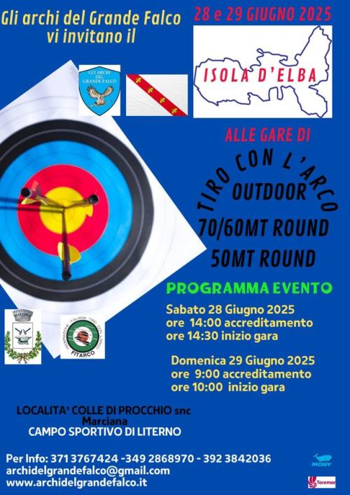 Ebbene si, dopo il Trofeo Pinocchio Fitarco fase regionale di Maggio scorso, gli Archi del Grande Falco organizzano con orgoglio sempre al campo di tiro a Procchio e per la prima volta all'Isola d'Elba le gare Fitarco di tipologie Round 50/60/70 regionali, dove si potranno vedere anche tiri a lunghe distanze olimpiche e vari tipi di arco, dal longbow, all'arco nudo, all'olimpico ed il compound.
