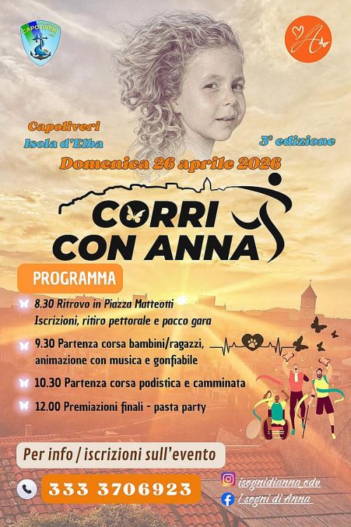 Organizzata da I Sogni di Anna Odv e ASD Polisport Capoliveri, con il patrocinio del Comune di Capoliveri, la manifestazione giunta alla 3^ edizione avrà inizio alle 8.30 con la consegna dei pettorali, pacchi gara e iscrizioni, proseguirà alle 9.30 con la corsa dei bambini/e, ragazzi/e, alle 10.30 corsa e camminata (circa 6 km) mentre alle 12 si svolgeranno le premiazioni e il pasta party.